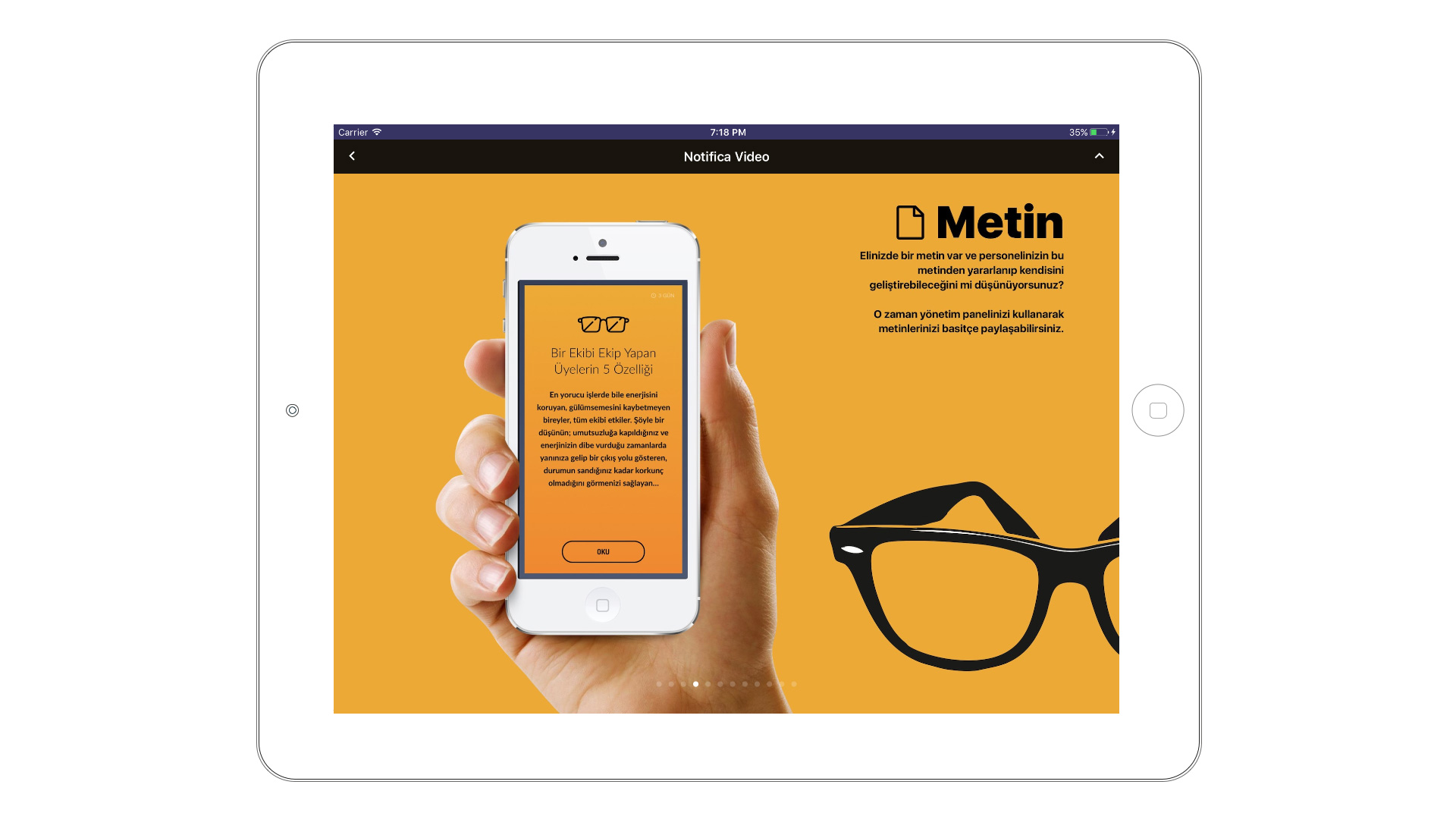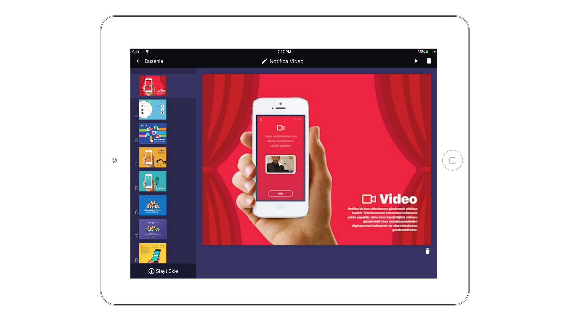 Saha çalışanlarının, merkez ekipleri tarafından sisteme yüklenmiş hazır sunum setlerini direkt kullanarak ya da mevcut sunum setleri içerisinden istediği slaytları kendisi belirleyerek özgün sunumlar oluşturabildikleri bir mobil uygulamadır.